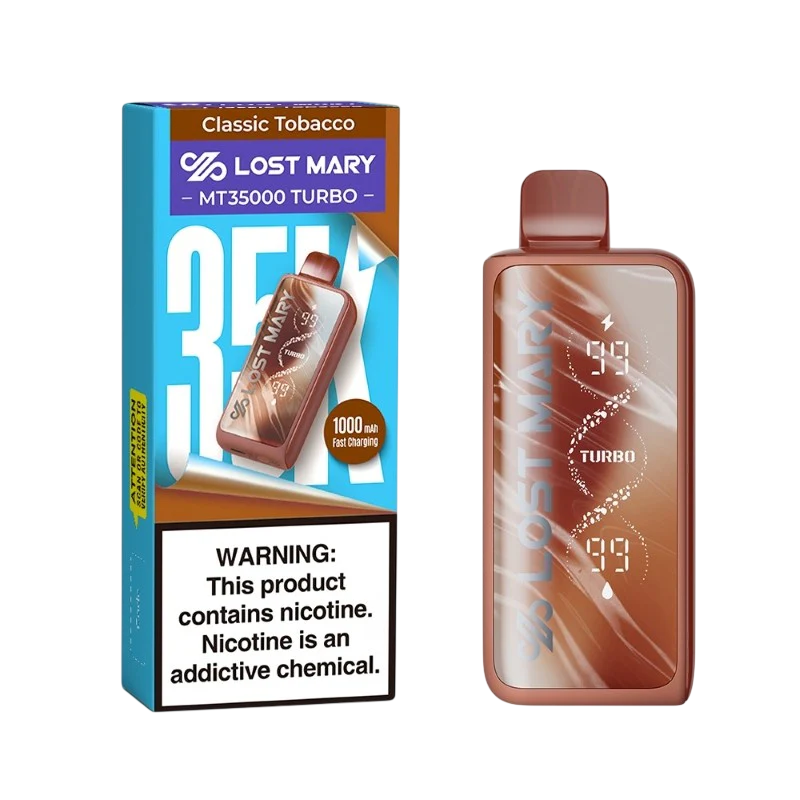 - Descubre el vaporizador Classic Tobacco Lost Mary MT35000 Turbo : una tradición atemporal. Las ricas y auténticas notas de tabaco se combinan con una suave calidez terrosa para crear un perfil familiar y satisfactorio en cada calada, ideal para quienes disfrutan de sabores tradicionales y sin complicaciones durante todo el día.